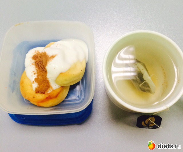 Полдник: 2 сырника, йогурт, корица, белый чай