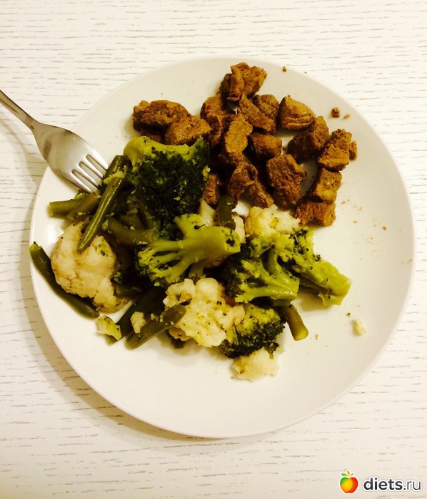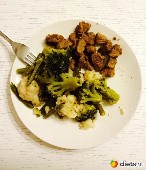 Ужин: говядина тушеная, брокколи, цветная капуста, фасоль стручковая