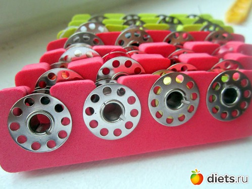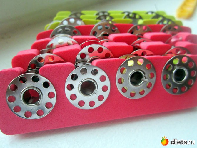 3. Оказывается, силиконовый разделитель для педикюра можно приспособить для хранения шпулек и маленьких мотков ниток.