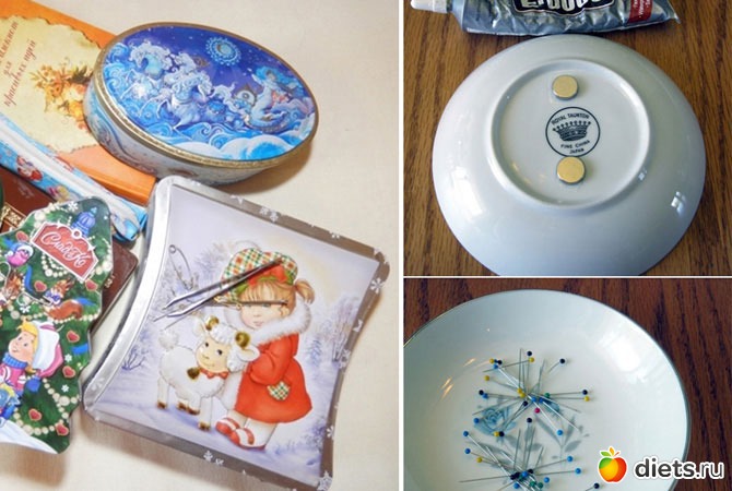 9. Идея для хранения булавок, иголок и прочих металлических мелочей: прикрепив магнит с обратной стороны блюдца, вы зафиксируете острые предметы в одном месте, при этом они всё равно будут под рукой!