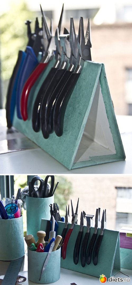 10. Очень удобно хранить инструменты на столе, закрепив их на картонном стенде!