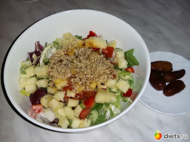 Салатный микс+огурец+чуть-чуть помидорки+кусочки ананаса+красный слад.перец+15 г перемолотых грецких орехов, все залила лимонным соком и посыпала "карри". Ну и вкусно оказалось!