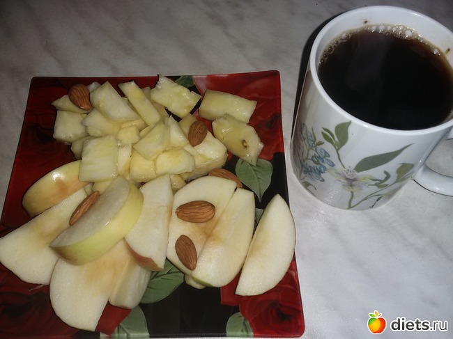 яблоко, кусочки ананаса,6 миндальных орешков, черный кофе.