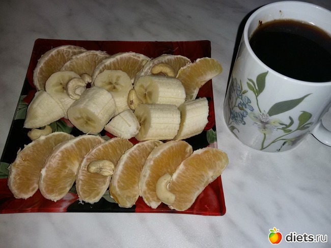 бананово-ореховое пюре (1 банан+20 г кешью в блендере), черный кофе. Пюре подсмотрела у кого-то из девочек в дневнике
