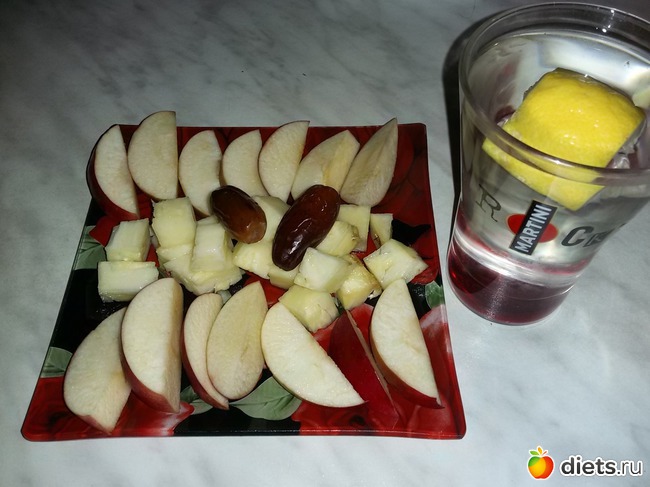яблоко, ананас и 2 финика. И вода с лимоном-чай и кофе уже не лезут!