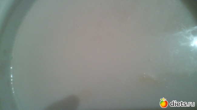 Смыла с себя эту смесь, набрала ванну и добавила туда предварительно приготовленное молочко с медом. Молочко было куплено домашнее. Закипятила.Добавила мед. Смесь стала похожа на топленое молоко и даже покрылась пенкой пока остывала.