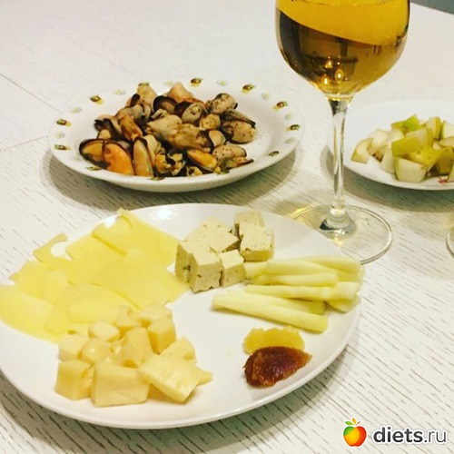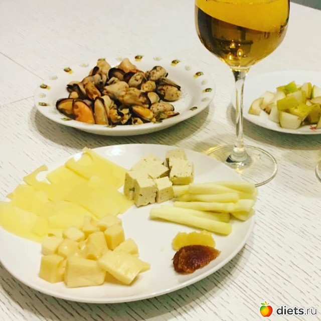 Ужин или "просто отвал башки": бокал белого сухого вина, мидии, сыр, груша