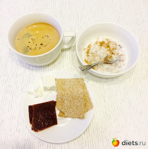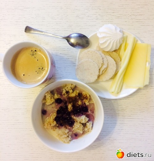 Завтрак: ячневая каша с черникой и миндальным молоком, хлебцы, сыр, половина зефирки, кофе