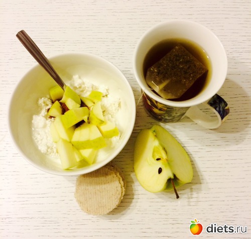 Ужин: творог с яблоком и какао, хлебцы, ромашковый чай