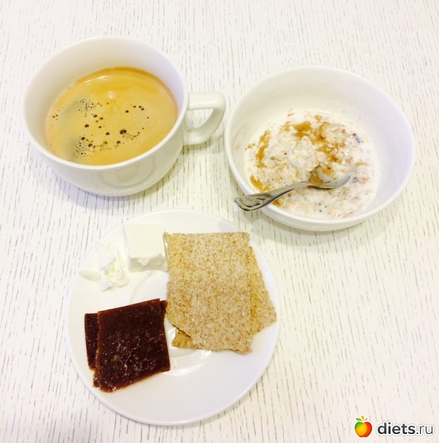 Завтрак: мюсли с кефиром, хлебец из пророщенной пшеницы, фета, пастилка с яблоком и инжиром, кофе