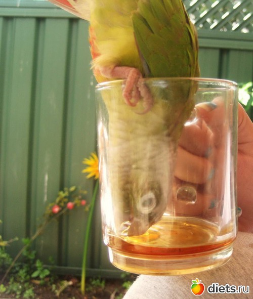 у тети тоже попугай,пьет и закусывает то горчицей,то пиццей,вобщем что на столе то и будет,а утром пить ему нужно)