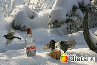 Когда в обед решили выпить и открыли бутылку, откуда - то появилось несколько синичек. Выпили мы немного и ради интереса облили наливкой из бутылки толстый кусок хлеба и прицепили на сук в метрах 10 от нас.