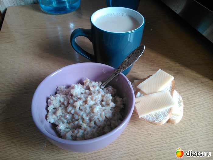 Завтрак - каша "5 злаков", 2 бутерброда с сыром, чай с молоком...