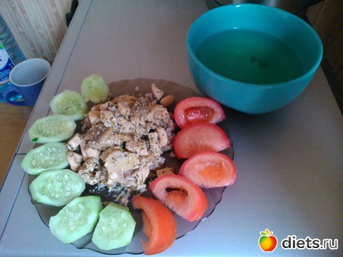Обед - 2 ст.ложки гречки, куриная грудка тушеная с шампиньонами в натуральном йогурте, половина огурца, половина помидора, куриный бульон...