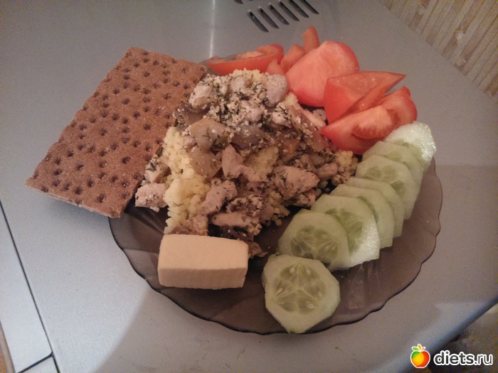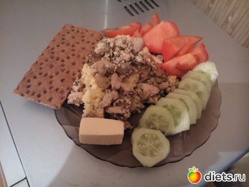 Ужин - пшено около 2-3 ст. ложек, тушеная куриная грудка, половина огурца, половина помидора, кусочек сыра...