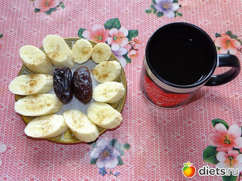 - Зеленый чай с лимоном, банан, обсыпанный корицей и финики