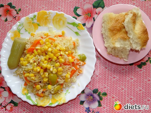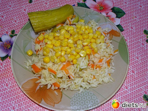 - Рис с морковью, луком, оливками, кукурузой, половина соленого огурца