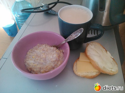 Завтрак - каша "5 злаков", 2 бутерброда с твердым и плавленым сыром, чай с молоком без сахара...