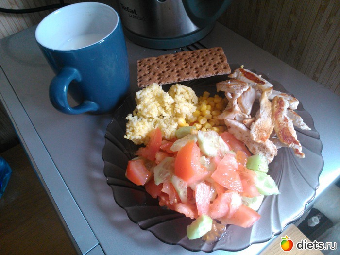 Обед - куриная грудка обжаренная на сухой сковороде, пшено, кукуруза, салат, половина стакана молока, хлебец есть не стала...