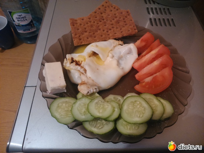 Ужин - 2 яйца жаренные без масла ( лучше было отварить но почему-то я забыла этот способ приготовления, сообразила только когда съела), половина огурца, половина помидора, 2 хлеба, плавленый сыр..
