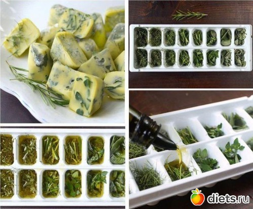 Заполните зеленью в формочки для льда, заливайте оливковым или растопленным сливочным маслом - и в морозилку. Потом в салаты можно будет добавлять или в картошечку!