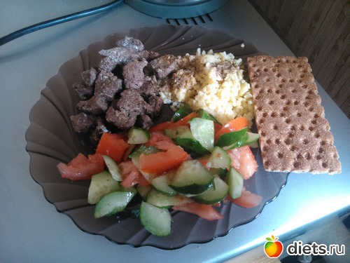 Обед - тушеная печенька, салат, пшено, хлебец, половина стакана молока...