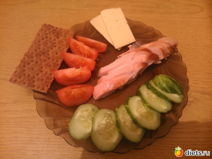 Ужин - копченая грудка, половина огурца, половина помидора, твердый сыр...