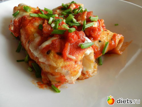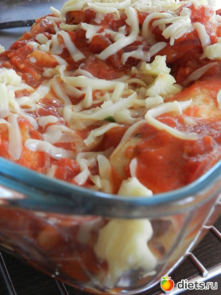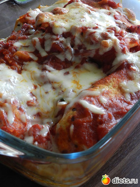 Выложенные конвертики заливаем оставшимся соусом. Посыпаем второй половиной сыра и отправляем в духовку минут на 25. Чтобы сыр расплавился, но подсыхать не начал.