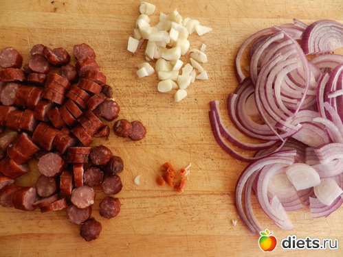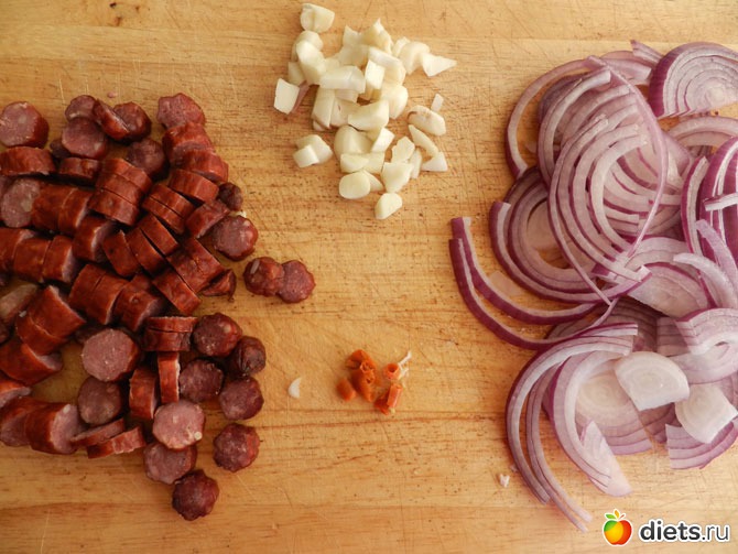 Чили освобождаем от костей и мелко рубим. Так же мелко рубим чеснок. Лук нарезаем полукольцами. Нарезаем колбаски. Сыр натираем на крупной тёрке.
