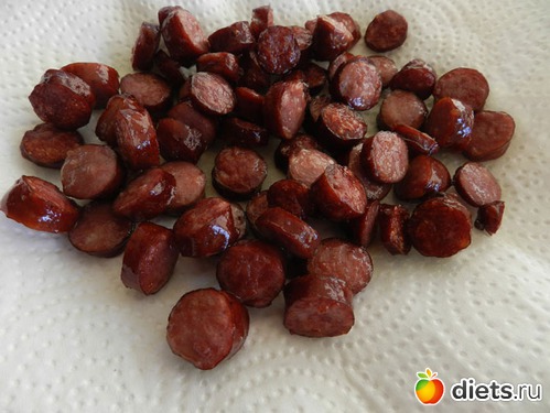 В глубокой сковородке обжариваем колбаски. Выкладываем на бумажное полотенце, чтобы убрать лишний жир.