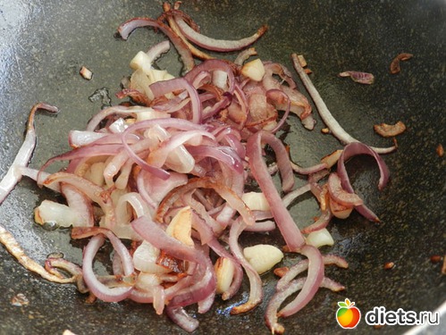 В сковородке на жире, который вытопился из колбасок, обжариваем лук и чеснок.