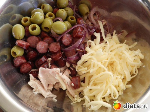 Готовим начинку: в миску клад\м порезанные на крупные куски курицу, колбаски, половину сыра, оливки, половину обжаренного лука и чеснока. Мне проще сразу разделить начинку на 8 одинаковых частей: сначала пополам, потом ещё раз пополам каждую половинку, и ещё раз пополам уже четвертинки. Это упростит и ускорит приготовление.