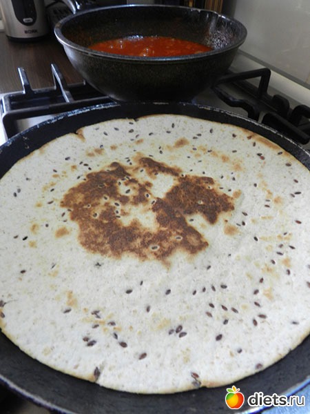 Половину соуса выливаем в жаропрочную форму, в которой будем запекать. Разогреваем сковородку. И на сухой сковородке с двух сторон обжариваем лепёшки.