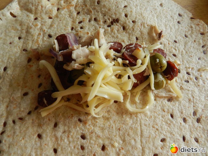 Очень важно соблюдать последовательность. Сначала прогреваем лепёшку примерно по 40-60 секунд с каждой стороны. Убираем её на подготовленную доску. Немедленно кладем в центр начинку, которую отмерили заранее. И пока лепёшка тёплая, сворачиваем плотным конвертом, а затем выкладываем её в миску на соус швом вниз.
