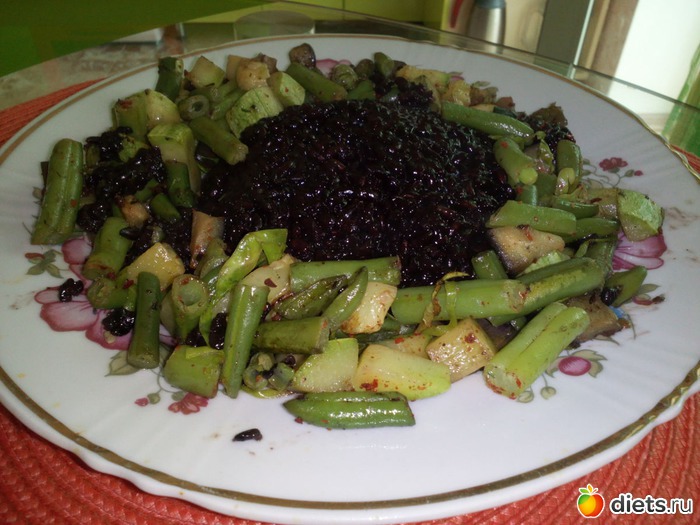 Тушеные на ложке масла струч.фасоль, баклажан и кабачок. Вместе с рисом просто офигительно вкуснейшее блюдо!