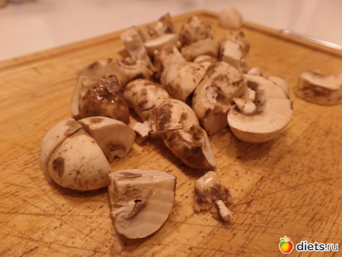 Грибы режем, но не мелко. Лучше на четвертинки. Одновременно ставим духовку разогреваться до 180 градусов.