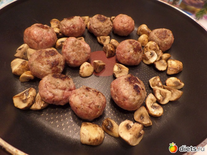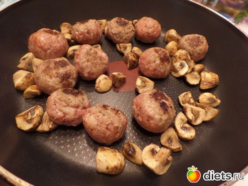 Разогреваем сковороду. И на сухой сковороде одновременно слегка обжариваем замороженные тефтельки и грибы. Недолго, буквально 5-6 минут, чтобы тефтели зарумянились.