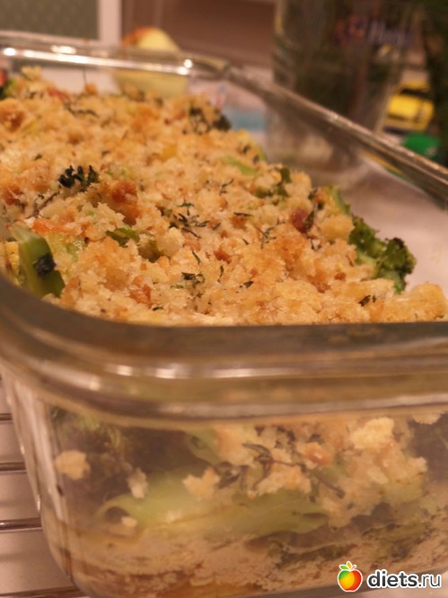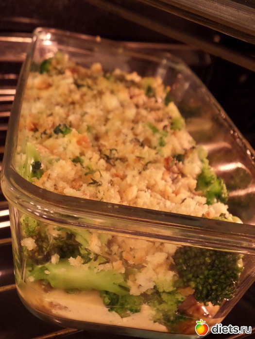 В жаропрочную форму выкладываем брокколи и тефтели с грибами, заливаем соусом и сверху посыпаем сухарями. По желанию можно добавить тёртый сыр. Но я готовила блюдо на ужин и хотела его максимально «облегчить».