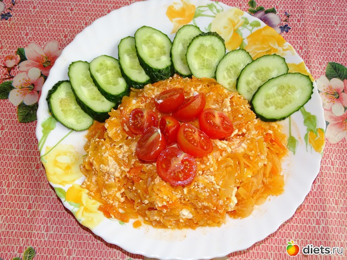 - Та же тушеная капуста с творогом, помидоры черри, огурец + Мацони