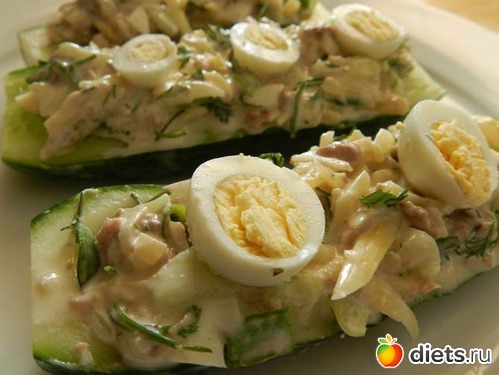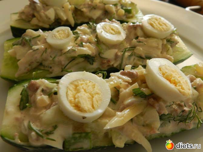Заполняем огурцы начинкой. Можно украсить перепелиным яйцом, веточкой петрушки, каперсами или оливками. Но можно и не украшать вовсе.