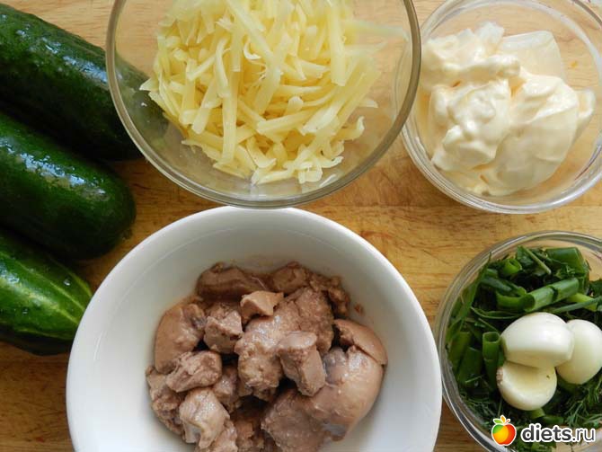 Смешиваем мякоть огурца, печень трески, сыр, чеснок и зелень. Пробуем. Если нужно, добавим соль, но обычно не требуется: соль уже есть в сыре и майонезе.