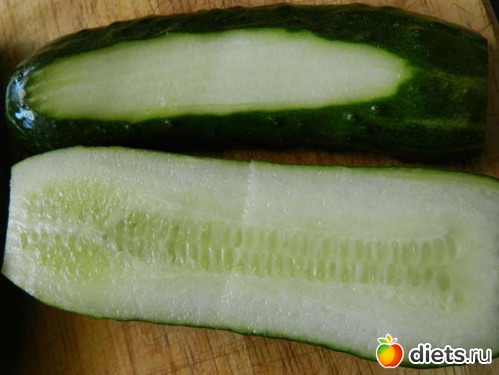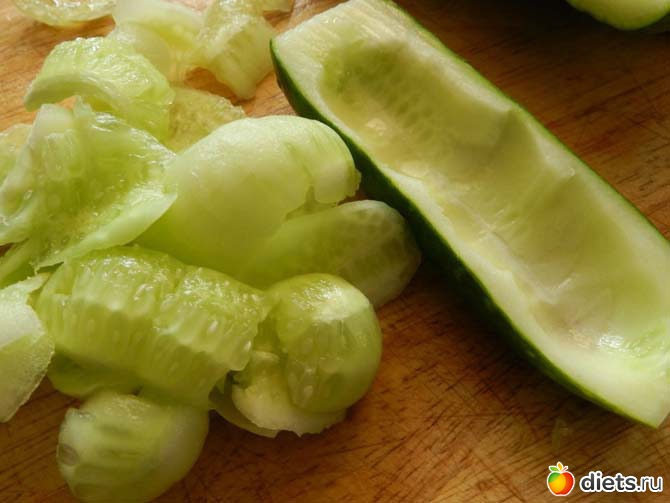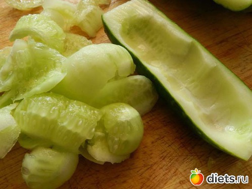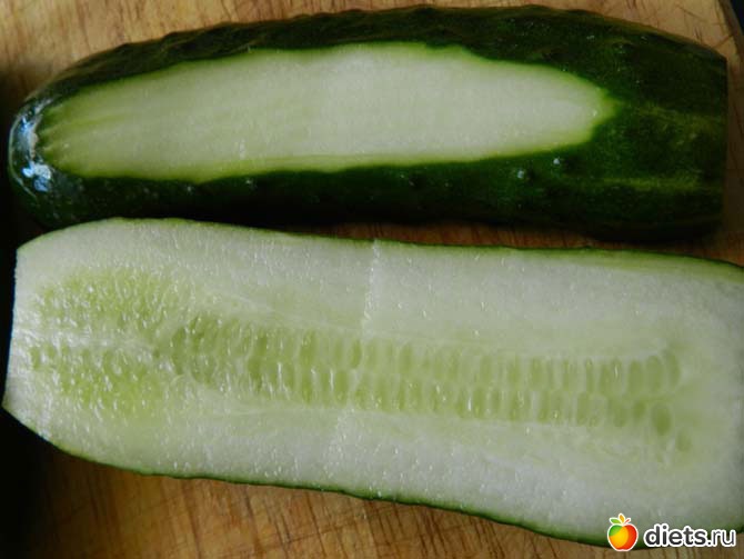 У огурцов обрезаем кончики, разрезаем пополам. Сезон грунтовых огурцов заканчивается, и если шкурка очень плотная, то лучше её срезать. Дно будущих «лодочек» подрезаем так, чтобы придать устойчивость, и они не заваливались на бок.