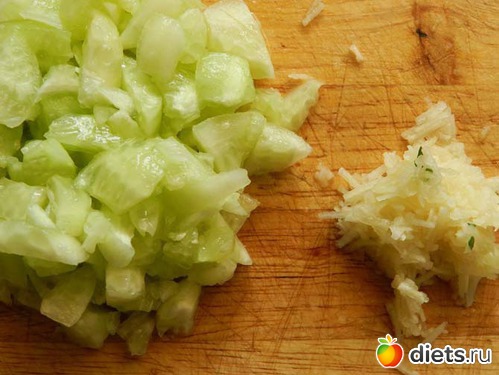 Мякоть огурца мелко нарезаем, чеснок натираем на мелкой тёрке.