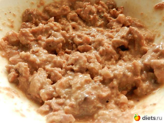 Из банки с печенью трески сливаем масло и разминаем содержимое вилкой.