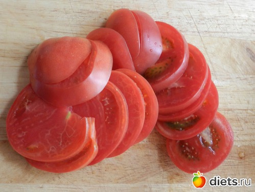 Из помидор вырезаем так называемые «попки». Режем каждую примерно на 14 кружков (крайние нам не понадобятся).