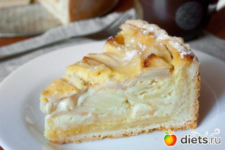 4. Форму для запекания смазать маслом. Раскатанное в пласт тесто выложить в форму. Сформировать из него бортики. На тесто положить яблоки и залить сметанным соусом. Выпекается пирог 45- 50 минут в духовке с температурой 180 градусов. Перед подачей на стол пирог разрезается.