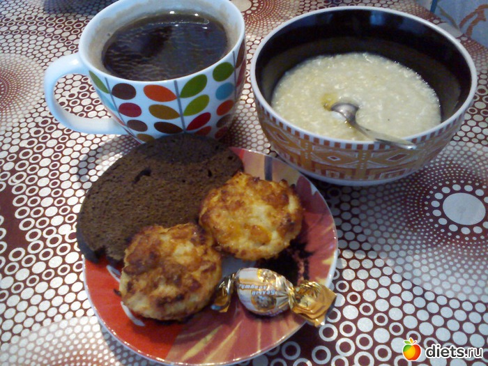 Завтрак - пшенная каша + 2 курино-сырных маффина + кусок хлеба + конфета + чай