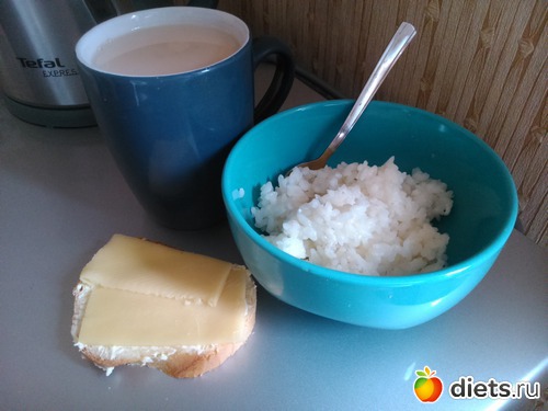 Завтрак - рисовая каша, 1 бутерброд с сыром, чай с молоком...