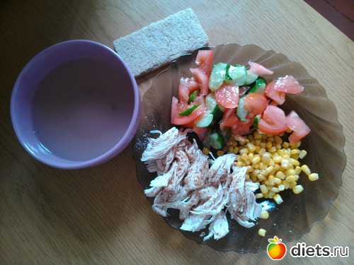 Обед - вареная грудка, салат, кукуруза, хлебец, куриный бульон...