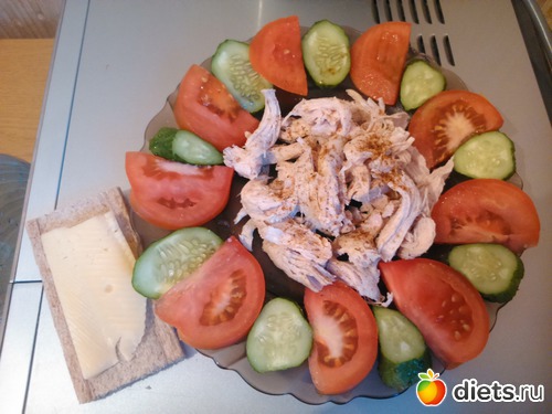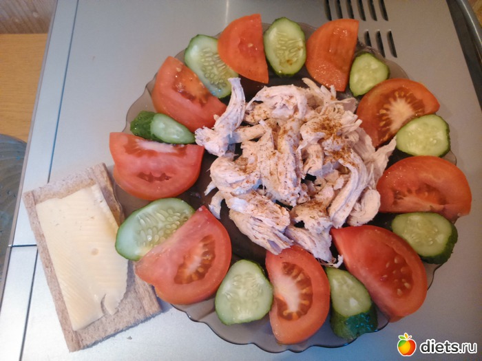 Ужин - вареная грудка, половина огурца, половина помидора, хлебец с сыром...